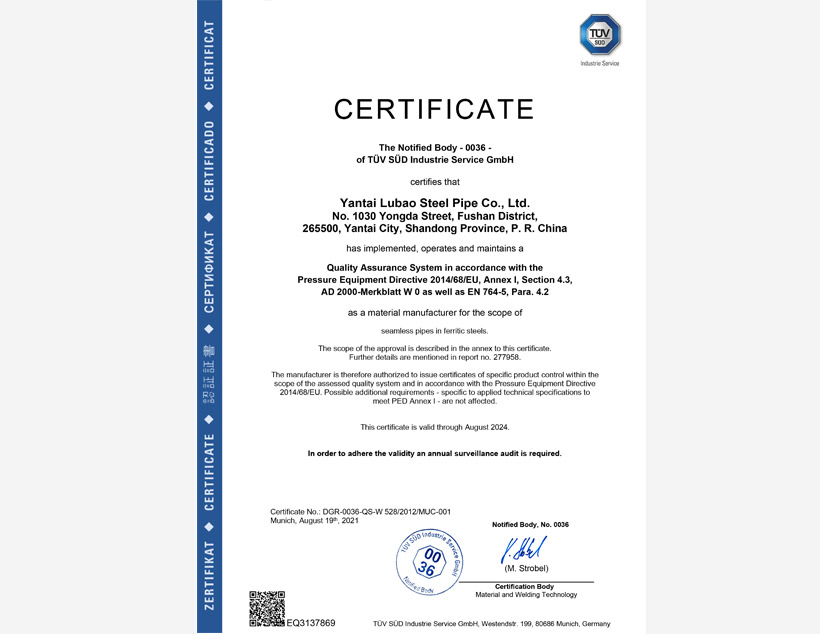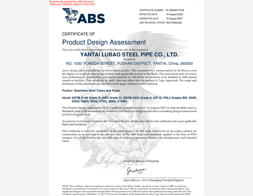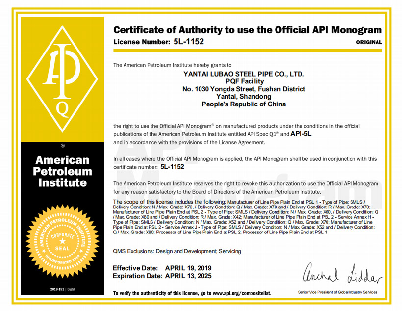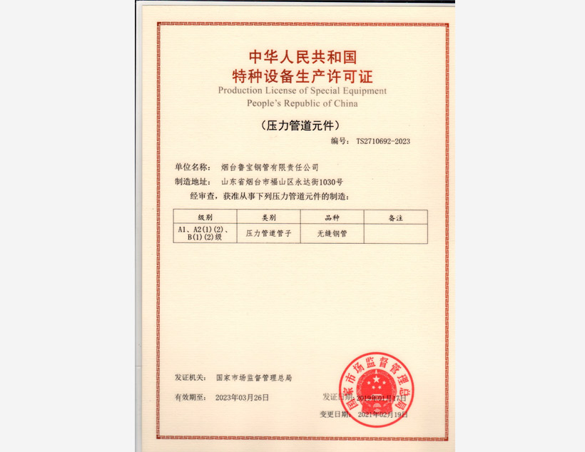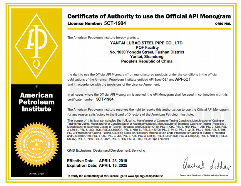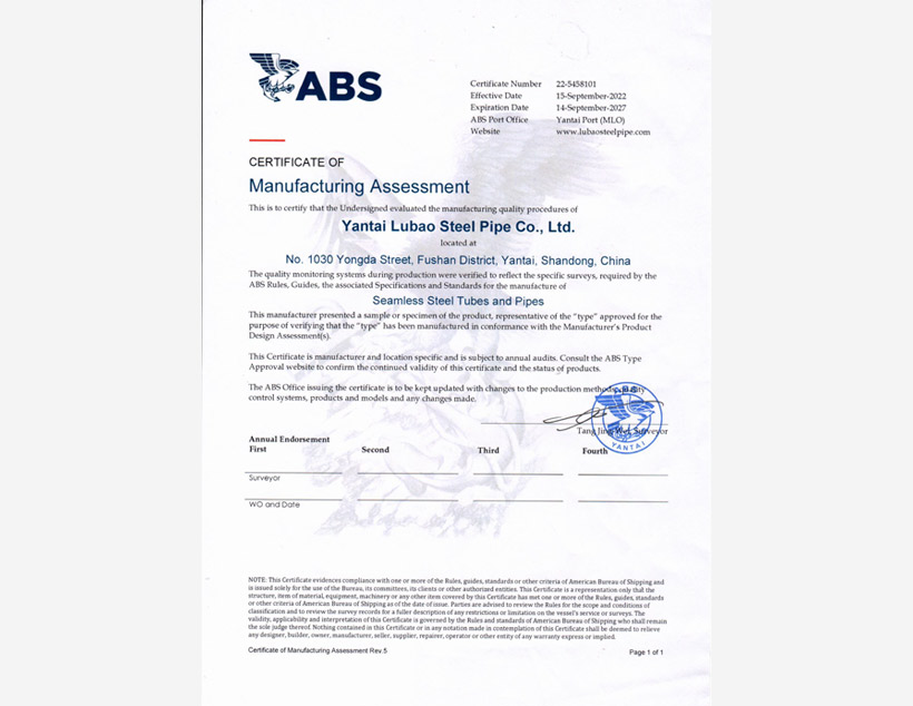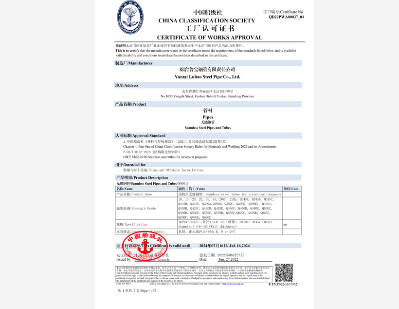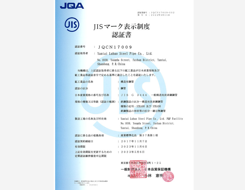 美國石油協(xié)會API 5CT認證????|????美國石油協(xié)會API 5L認證????|????TS(特種設(shè)備生產(chǎn)許可)????|????ABS PDA(美國船級社設(shè)計評估)認證????|????ABS MA(美國船級社工廠評估)認證????|????DNV(挪威船級社)認證 ????|???? CCS(中國船級社)工廠認可????|????? LR(勞氏船級社)認證????|????? PED(歐盟承壓設(shè)備指令)認證????|??? CPR(歐盟建筑用材料指令)認證????| JIS(日本工業(yè)標(biāo)準(zhǔn))認證