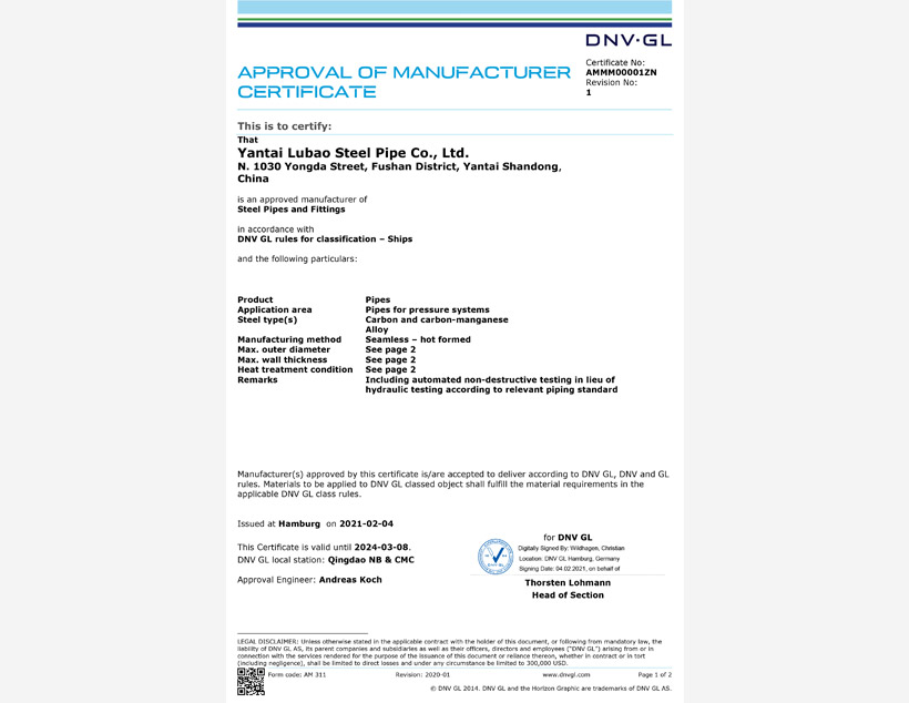 中國船級社CCS管線管及高溫作業(yè)用管認可證書