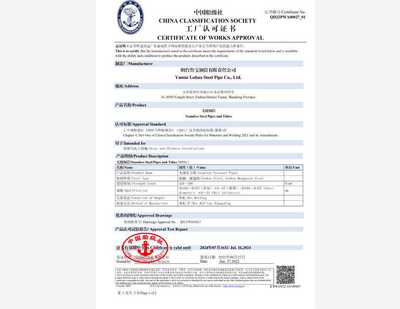 中國船級社CCS結(jié)構(gòu)管認可證書